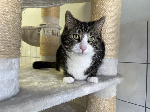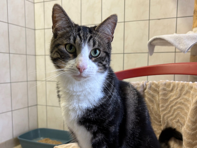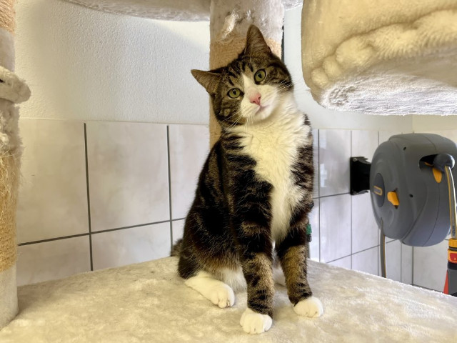 Van nature is hij wat verlegen en door de andere katten in de ruimte, houdt hij zich wat op de achtergrond. Ook heeft hij wat tijd nodig voor de kennismaking en moet je hem vaak echt even overhalen om naar je toe te komen. Maar als je wat rust om hem heen creeert en het ijs is gebroken overlaadt hij je juist met aandacht en kopjes en komt hij spinnend naast je liggen.