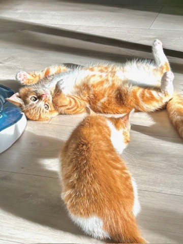 Samen zorgen ze voor leven in huis. Ze spelen met alles wat beweegt, maar hun absolute favoriet is het laserlichtje, waar ze enthousiast achteraan racen.