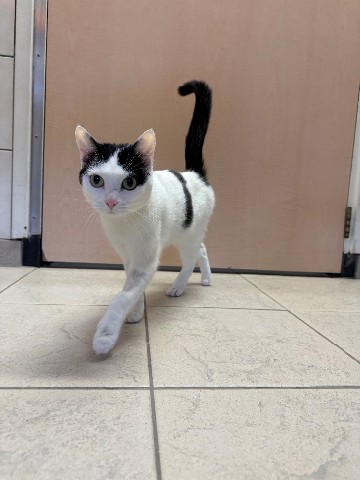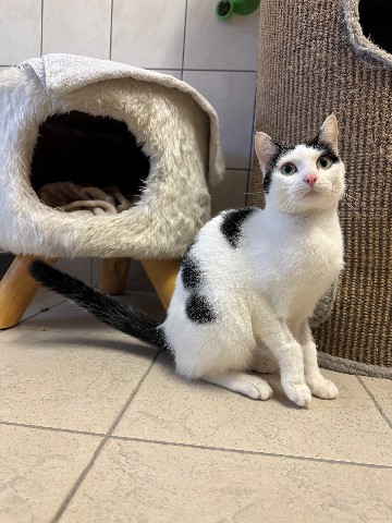 Het is een alleraardigst katje dat gek is op aandacht. Klein van stuk, maar je kunt haar niet over het hoofd zien. Ze meldt zich direct voor een aai en een praatje. Het aaien dient wel op haar voorwaarden te gebeuren, want hier heeft ze niet al te goede ervaringen mee gehad. De voorkant aaien graag, maar naarmate je naar achteren aait, gooit ze haar koppie om en kun je een pats verwachten. Tis maar dat je het weet…