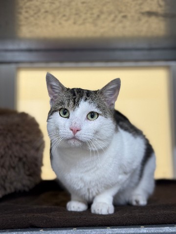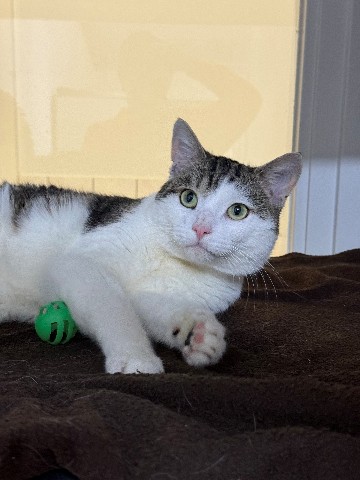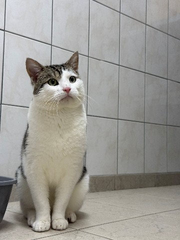 Leo werd op straat gevonden en door de dierenambulance bij ons binnengebracht. Waarom zijn eigenaar hem nooit heeft opgehaald, blijft voor ons een raadsel, want deze prachtige cypers-witte kater van twee jaar oud verovert ieders hart zodra hij binnenwandelt.