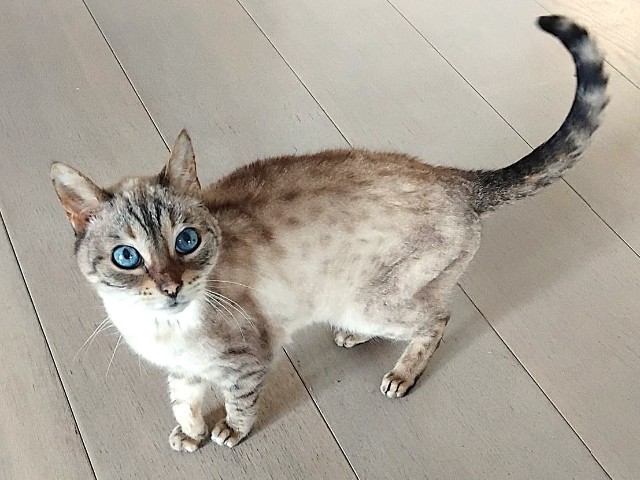 Catootje is 17 jaar en een klein, schattig kruising Bengaal poesje dat het nog verrassend goed doet. Ze slaapt graag, maar kan ineens ook nog enthousiast door het huis rennen. Vooral ’s avonds is ze dol op gezelschap: als het rustig is, komt ze gezellig bij je zitten en kruipt ze graag op schoot. Met haar glanzende vacht en mooie blauwe oogjes verovert ze meteen je hart. Eten vindt ze heerlijk, ze krijgt speciaal voer voor haar ontlasting en dat smikkelt ze graag op. Soms is ze door haar leeftijd even de weg kwijt en laat ze dat horen met een hard miauwtje. Als je dan tegen haar praat, is het meteen weer goed. Overdag gebeurt dit af en toe, ’s nachts slaapt ze gewoon lekker door.
